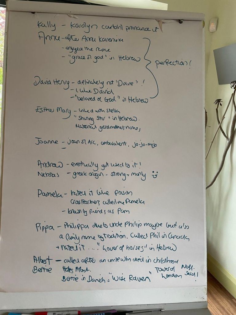 We ended by saying something about the name we had been given. Virgina reminded us of the origin of our names, usually Hebrew of Greek.