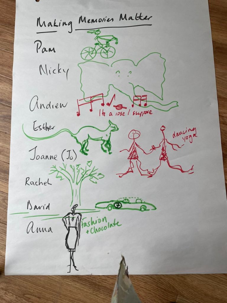 We began with saying our name and something about us, and Rachel attempted to draw that object. Pam started, by saying she liked to ride a bicycle: