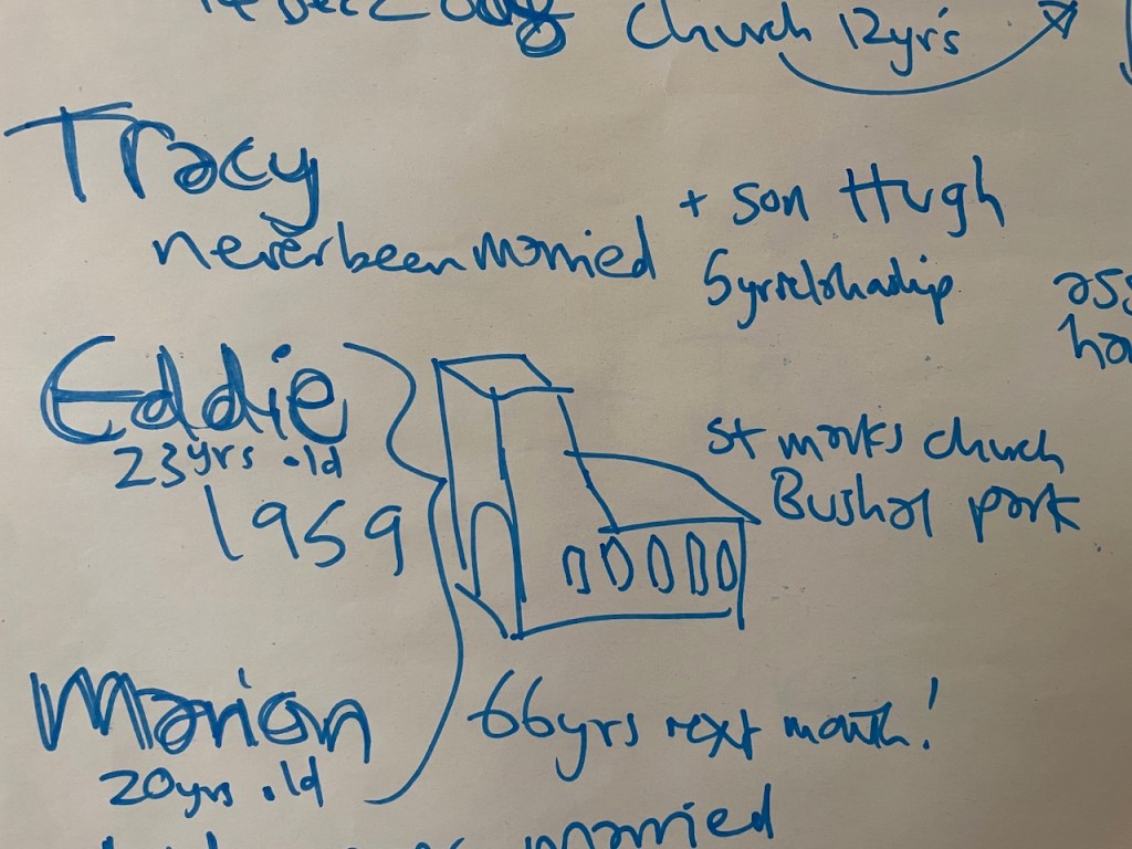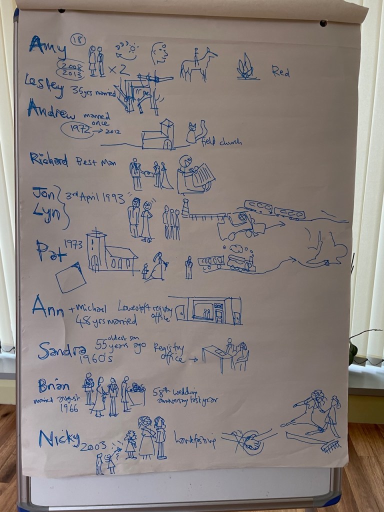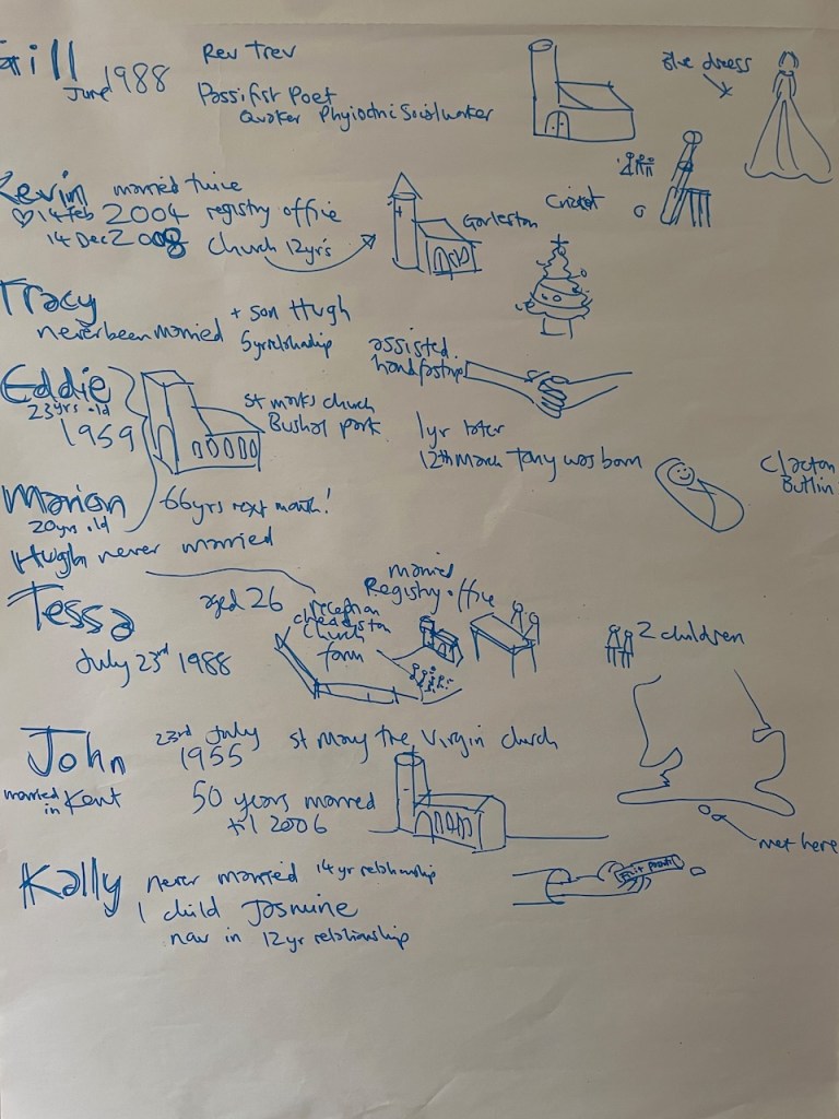 Great diversity among us: Married twice, both to the same woman / Never married / Married Nepali Hindi style in red / Married in Catfield Church / Best man to his friends wedding / Diss Registry office and after a train to Great Yarmounth for fish and chips ( because I love trains) / St Lawrance church Coventry in a tailor made white dress, bridesmaid was Murrial, followed by a train to Bornmouth / Resistry office Lowestoft / Met at teacher training college, married in a registry office / Not a happy occassion as my father in law was against the marriage / Never been married / St Marks Church Enfield, after meeting at Butlins / Church Farm Cheddiston church / Hayes, Kent honey moon in Devon.