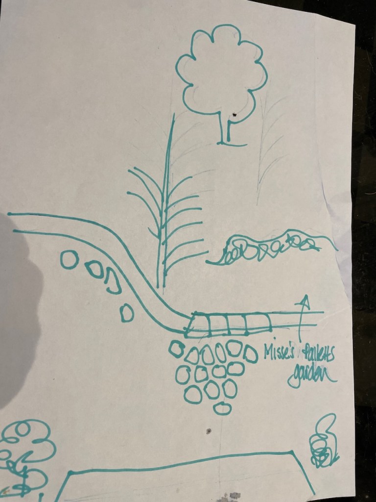 A surprising lasting experience for me was Leslie draing my home back garden. I’ve kept her drawing. I hadn’t visited this physical space in my past time for as far back as I can remember . As I relayed the story – for it did turn into a story – more and more jigsaw pieces kept appearing to fall into place. At first it was the wall – Norfolk Flint with red capping stones at the top, and the height that I could ease my body up and climb over. Then it was the wilderness and garden I climbed into – Miss Pallets garden. The Miss Pallets, two spinster sisters, must have through my mother allowed me into their garden, although my mother was not keen for the frequency of my escape into it. (They were many spinster aunts that seemed to live up Quebec road). It had trees, and along with formal areas, a rockery, rhododendrons, azaleas, it had a wild grass areas, with frogs and a stream. What a contrast to my mothers back garden, which was small, flat and rigorously maintained garden: lawn, no moss allowed, with conventional flower beds along each square side. Above all it was a worry, a constant need, a need to weed, to work to keep it up. I saw my mothers anxious face in my minds eye.