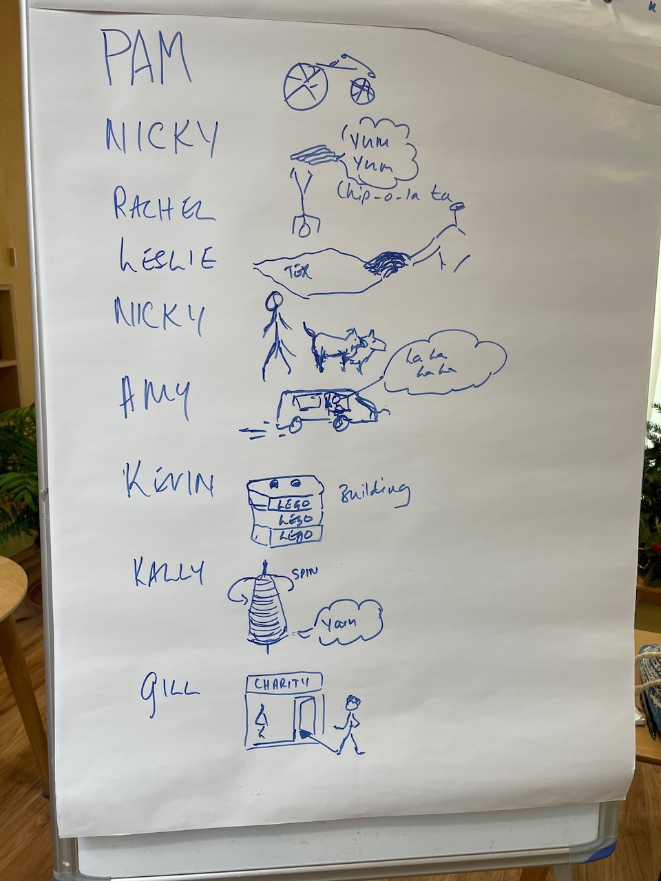 - Name and something you like doing. No heiratchy, democratic, drawing good for memory jog
