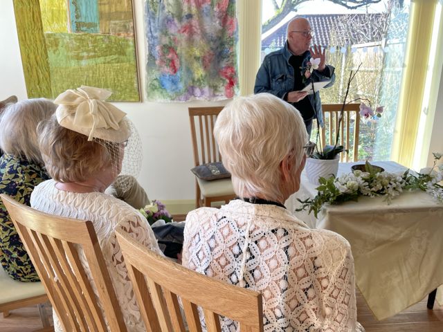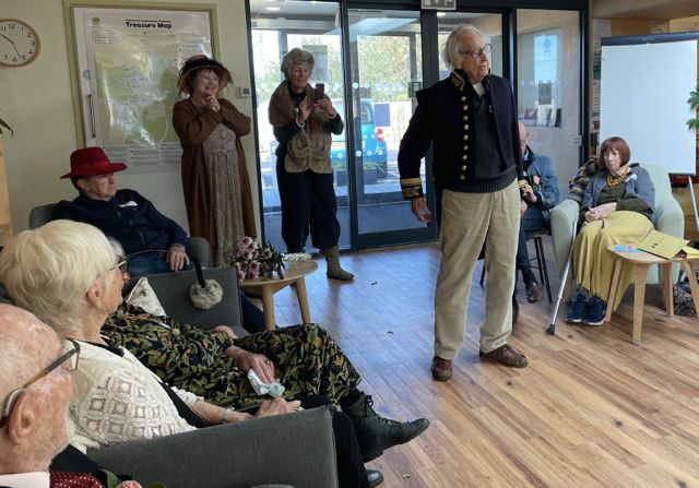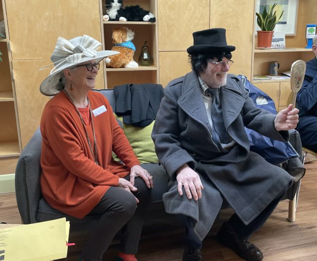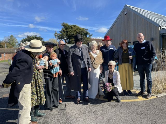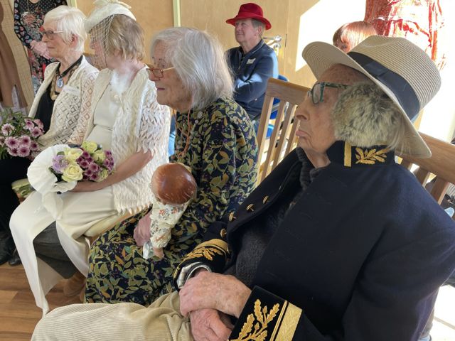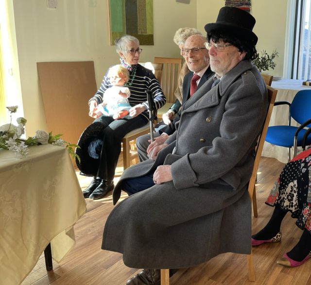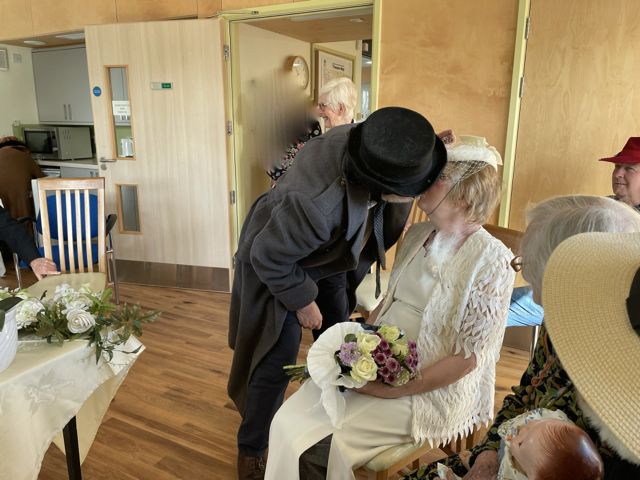 We found our roles. Roy and Irene – a surprise to them – were to be married. So Irene was fitted out in simple cream white dress, with veil hat, and a feather decoration worn by their daughter for her wedding. Mary – who became the chief dresser – sorted out the groom, with wig top hat and great coat – what a dashing groom he was. The Jilted Girlfriend, and Jilted Boyfriend got into role, both gatecrashed the wedding. The Best Man, Chief Bridesmaid, the official Photographer, the guests for the Bride and those for the Groom.