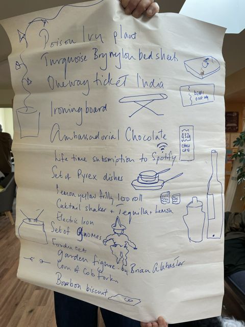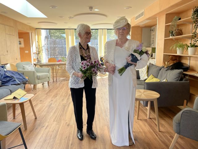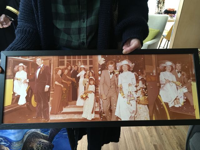 It was a glorious wedding. All were welcomed back after a two week break (arriving to Frank Sinatra singing Love and Marriage). They’d dressed up. The Ambassador rocked up in his braided jacket, the trousers with gold stripes on sides left on the hanger to admire; Gavin looking dapper his silk tie of beach balls, Jan in her Rolling stone dress; Gorden also dapper in a dark jacket; Lesley in warm ochre. They bought memorabilia from their weddings to deck the table: Jackie the hat she wore and the photograph of her wearing it, Will’s first marriage; Norman bought what looked like Lesley’s wedding dress; Mary and Peters marriage photos, with Peter looking just like George Best, radiant and cheeky along with their marriage certificate, describing the fathers professions.